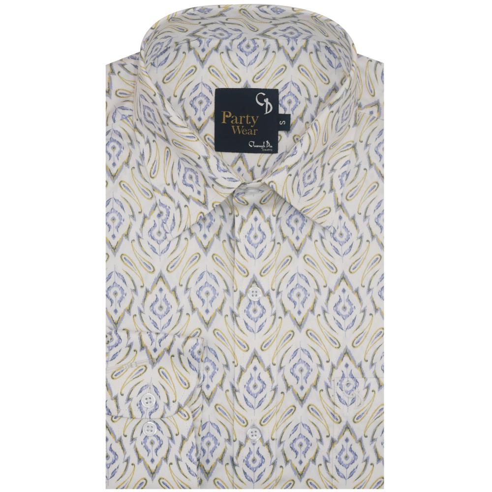 A stylish blended-fabric shirt featuring a vibrant party print, offering a modern, trendy look perfect for festive and casual occasions.